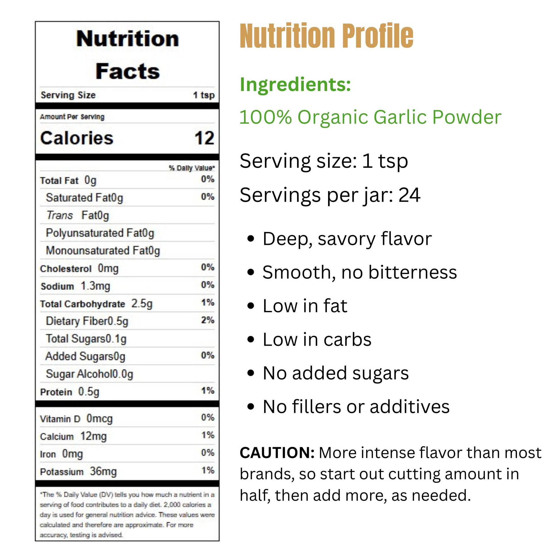 Field2Fork's Organic Garlic Powder hits your nose the second you open the jar. Slow-dried to preserve that rich, savory kick, it is strong and savory, yet never bitter. Made from 100% USDA-certified organic garlic, this bold, single-ingredient seasoning is ground fresh for a rich flavor and freshness you can taste in every bite.